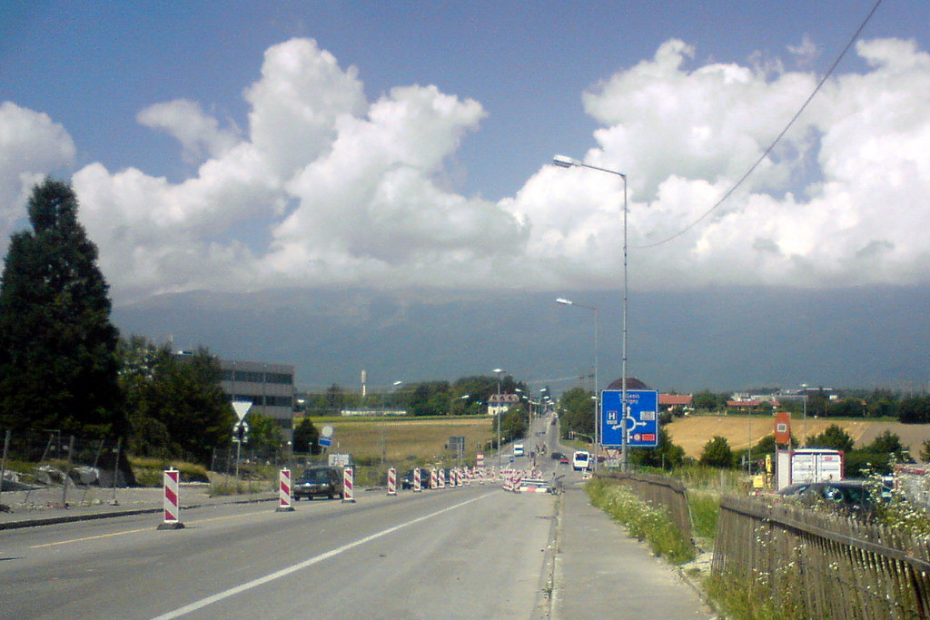 Из аэропорта можно выйти как на швейцарскую, так и на французскую сторону. От швейцарского выхода почти до самого ЦЕРНа едет двадцать восьмой автобус, и на последних нескольких остановках с него можно пересесть на пятьдесят шестой, который и довозит практически до кнопки “A”. Кататься по городу можно за три франка целый час без ограничений. В первый раз я не пересаживался и вышел на конечной 28-го. Вид при выходе из автобуса открывается примерно такой.