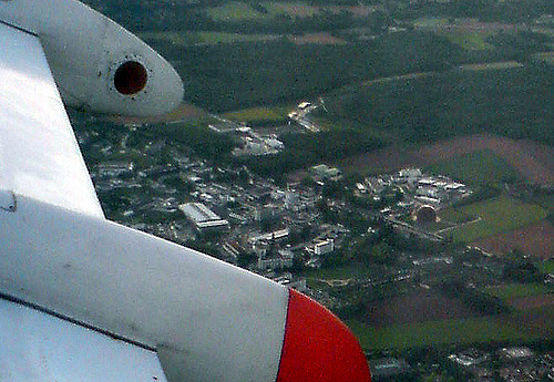 Территории собственно ЦЕРНа покрыты одним большим вайфаем, доступ к которому дают после получения церновского ID и последующей процедуры регистрации компьютера по мак-адресу через веб-интерфейс. Вышло у меня это раза с третьего, что-то у них пару раз глючило. Вообще, общий уровень бюрократии очень здорово напоминает бардак, царящий на сайте www.cern.ch. Опять-таки это что-то не французское, а именно швейцарское. Когда летел в Амстердам, удалось посмотреть на ЦЕРН сверху. Самолёты взлетают из аэропорта на юг. На фотографии вид, таким образом, на северо-запад. В правой части фотографии виден тот же глобус. Над красной частью крыла выделяется белый дом — это главное здание. В нём же проходят лекции и расположен ресторан. Левее примерно на пятую часть фотографии можно увидеть две диагональные полосы. Это двадцатое здание, в котором я сижу.